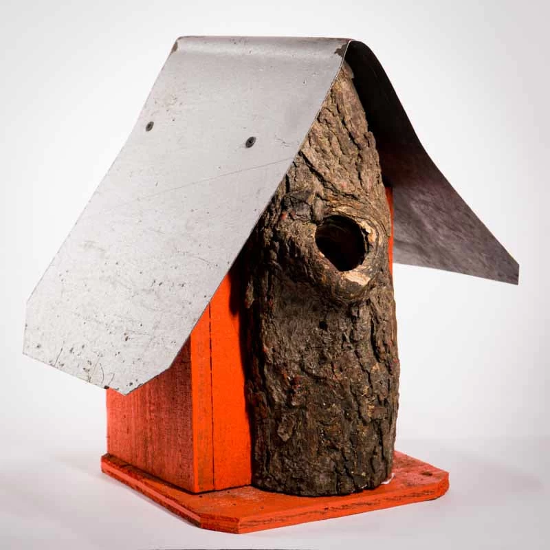 Rustic birdhouse is handcrafted in North Georgia from reclaimed materials and aged tin. An awesome nest site and roosting spot for feathered friends, the entry is cleverly concealed behind log’s natural opening. Provides nestlings superior protection from elements, and predators.