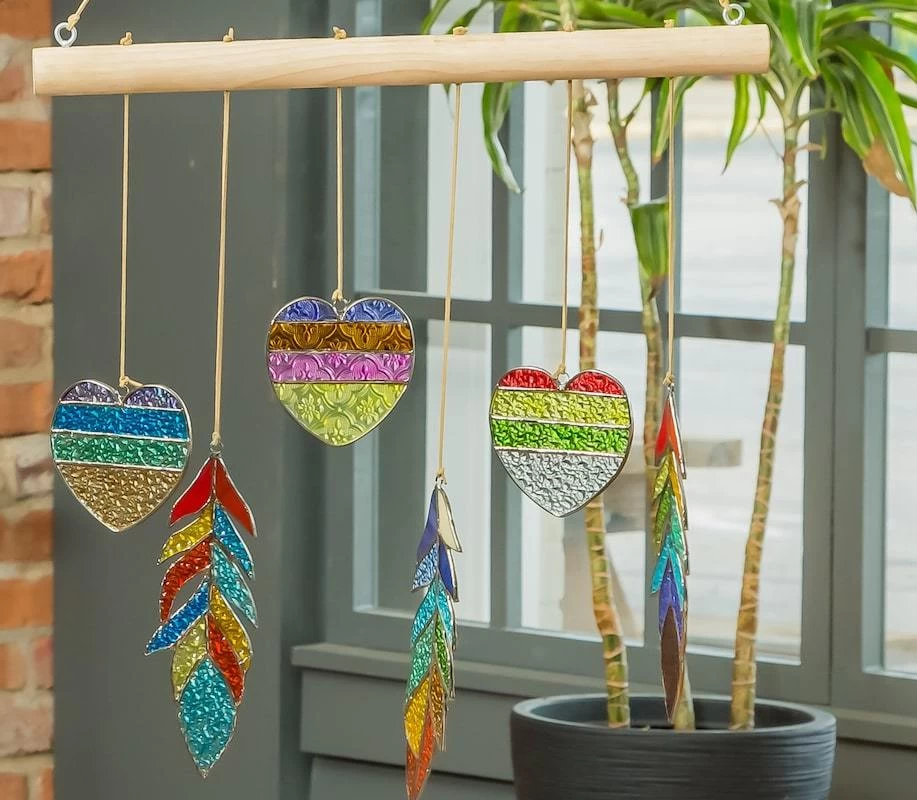 Colorful mobile or wind chime features heart and feather design in stunning textured glass that magically catches light.